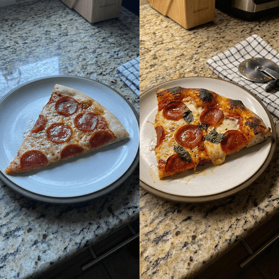 For example, take these two slices of pizza.One is the average chain pizza slice with low protein.You know the type.Tastes good in the moment, but it's not always very filling.